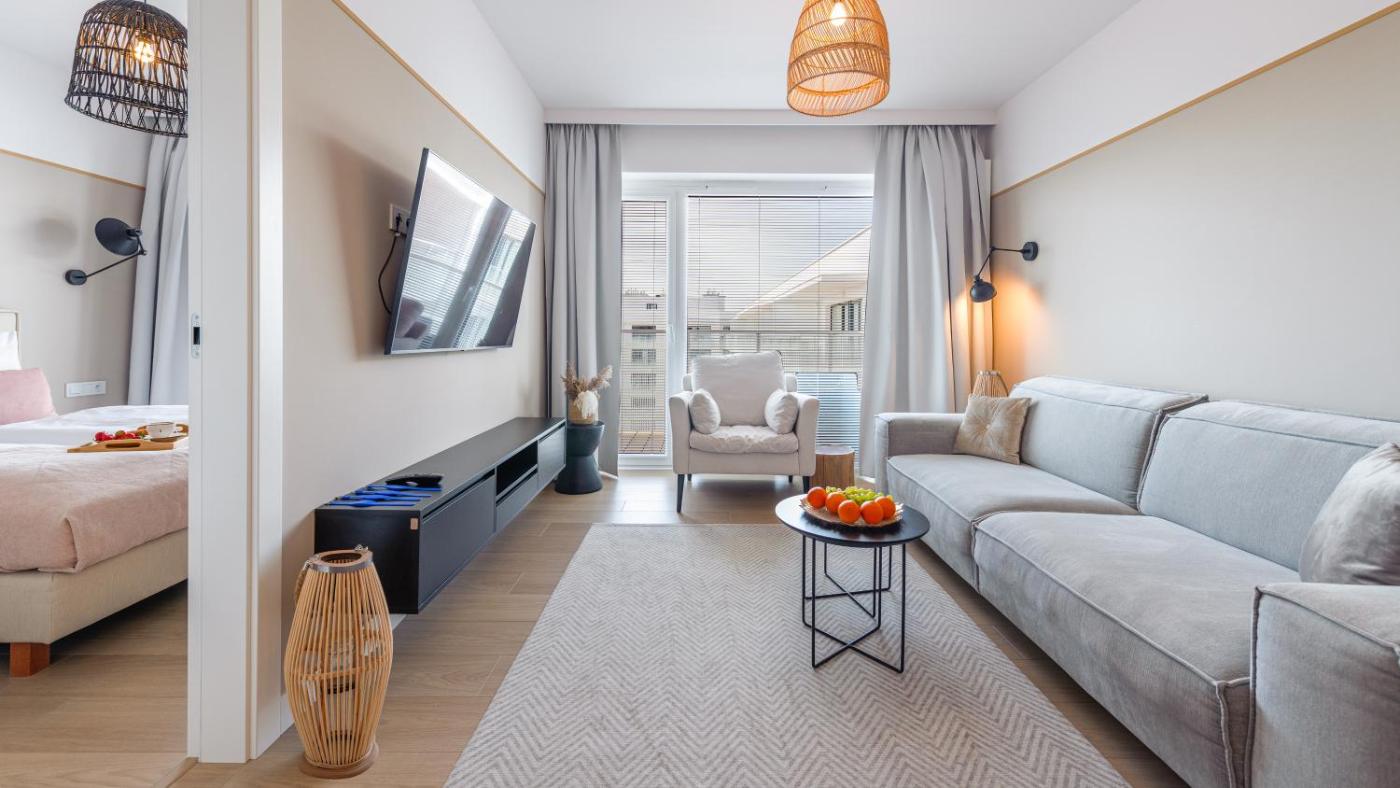 Apartament typu Deluxe z 1 sypialnią. This apartment is comprised of 1 living room, 1 separate bedroom and 1 bathroom with a shower and free toiletries. In the fully equipped kitchen, guests will find a stovetop, a refrigerator, a dishwasher and kitchenware. Featuring a balcony with ancourtyard view, this apartment also offers a washing machine and a flat-screen TV. The unit offers 2 beds. Apartament - 4 osobowy. Powierzchnia pokoju ok.: 49 mkw. ;