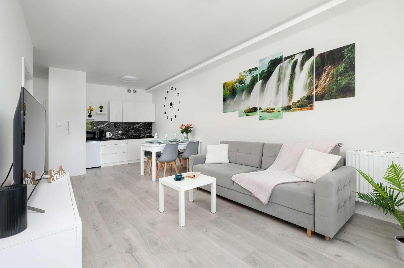 Apartament Rodzinny z 1 sypialnią. Featuring a private entrance, this apartment is comprised of 1 living room, 1 separate bedroom and 1 bathroom with a shower and a hairdryer. The fully equipped kitchenette has a stovetop, a refrigerator, kitchenware and a microwave. This apartment features a washing machine, a tea and coffee maker, a flat-screen TV with streaming services and a balcony. The unit offers 2 beds. Apartament - 5 osobowy. Powierzchnia pokoju ok.: 40 mkw.