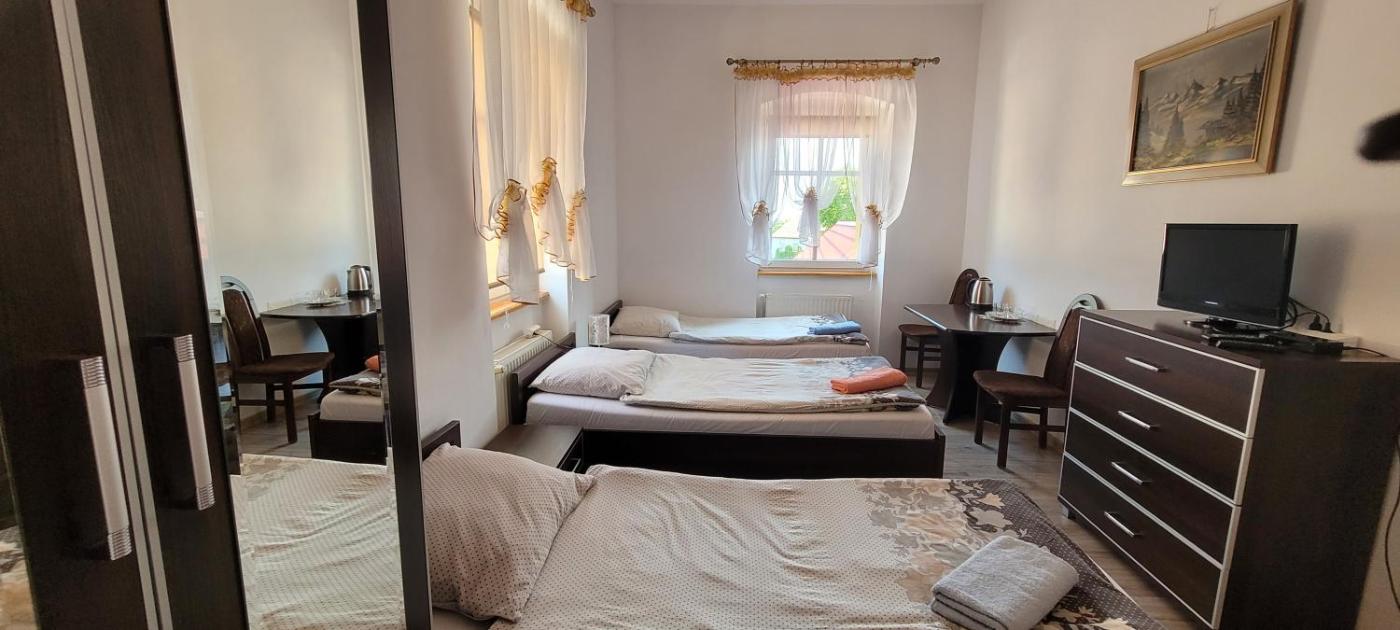 Pokój trzyosobowy. The triple room features a tea and coffee maker and a wardrobe, as well as a private bathroom boasting a shower. The triple room provides parquet floors, a tiled floor, heating, a TV, as well as city views. Powierzchnia pokoju ok.: 20 mkw. ;